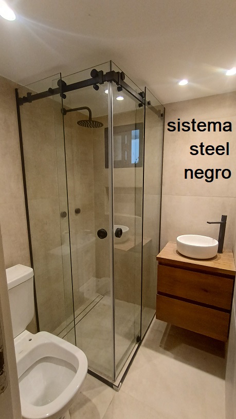 - La mampara esta fabricada en cristal Incoloro templado de 8 mm espesor con perfileria en acero inoxidable anodizado brillante o negro